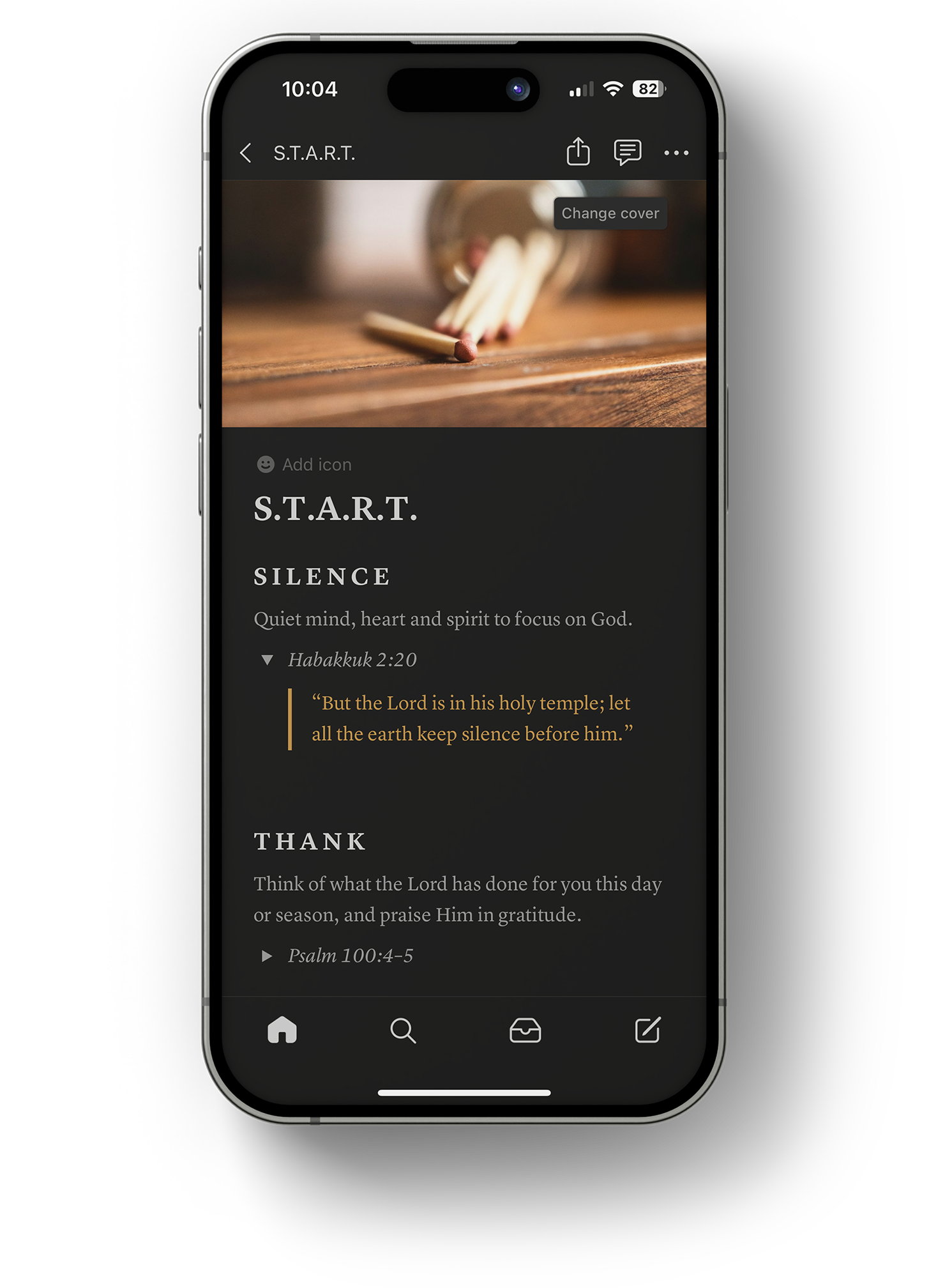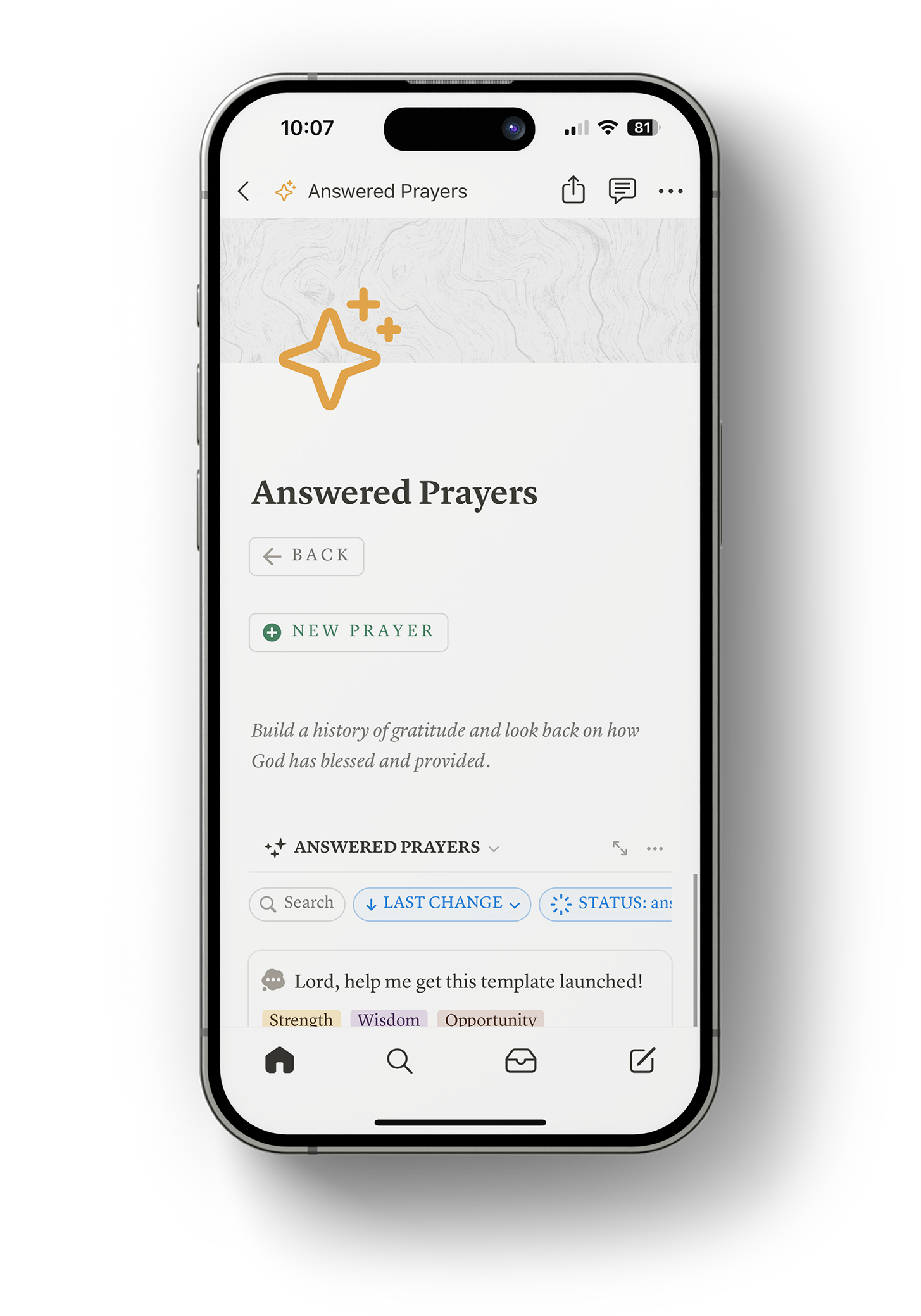 Statuses give each prayer its own lifecycle, keeping your digital prayer journal fresh and manageable. You can use whatever statuses make sense to you (remember, Notion is endlessly customizable). Here are the intentions behind each status that's built into the Prayer Den template. WAITING: Prayers start here by default, waiting to see what God will do. WRESTLING: This is for when things are moving in the wrong direction, but hope is not lost. Setbacks happen, and the enemy has small victories sometimes. But that's when we need to dig in and pursue God in prayer all the more. DEVELOPING: Use this when you see God at work bringing progress. A definitive "Yes" has not come, but it feels closer. ANSWERED: God has delivered! (as mentioned above, prayers need to be clearly defined in order to know when they've been answered) ARCHIVED: This one can feel less intuitive. We archive tasks and emails, but when should we archive a prayer? In the Prayer Den, archiving can mean a few things — "I've prayed over this, and now I leave it in Your hands" or "I'll revisit this later" or "This needs rephrasing to be more specific." Give yourself permission to archive prayers sometimes without guilt. After all, this clears clutter from the "For Today" view, focusing your prayer priorities.