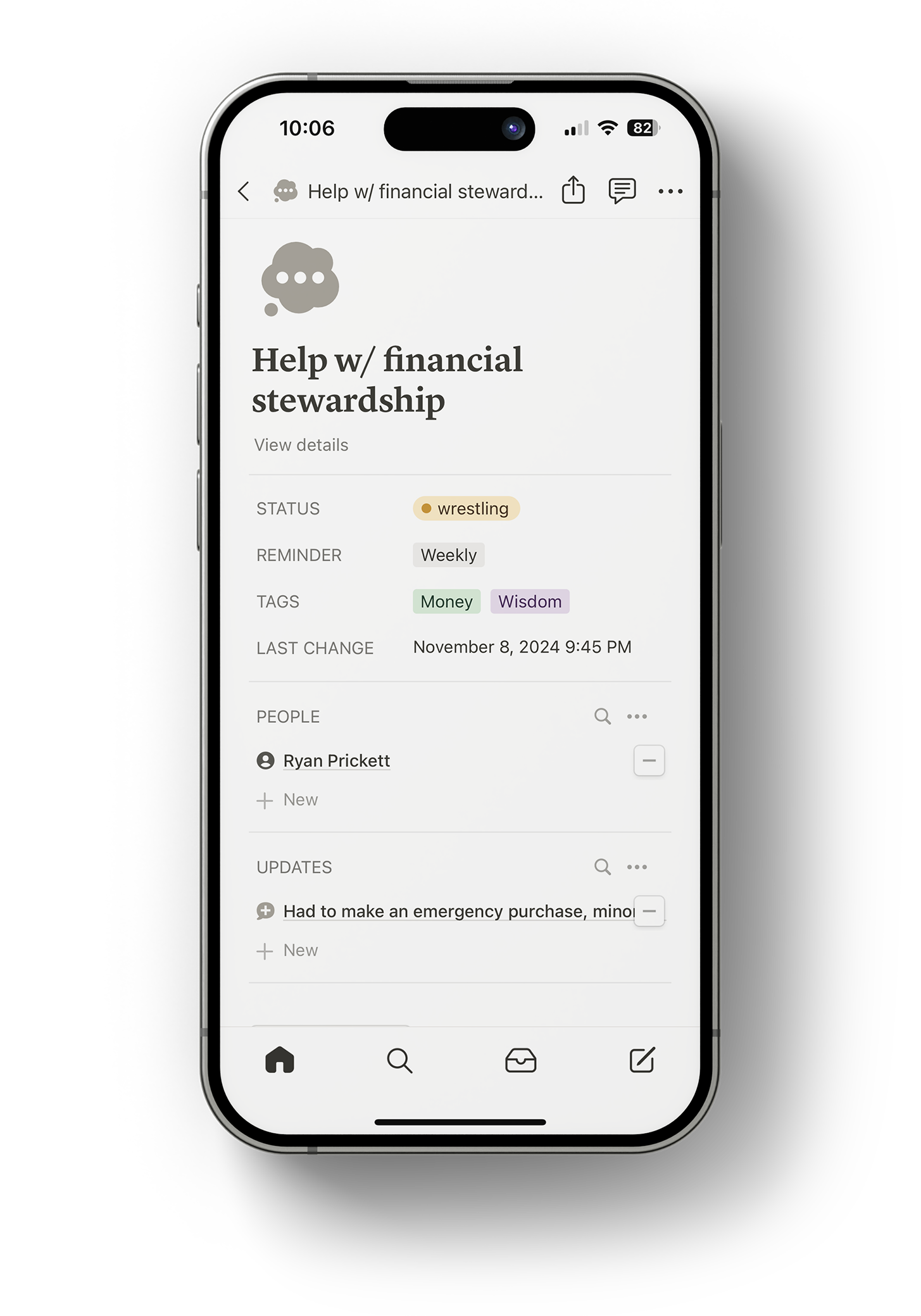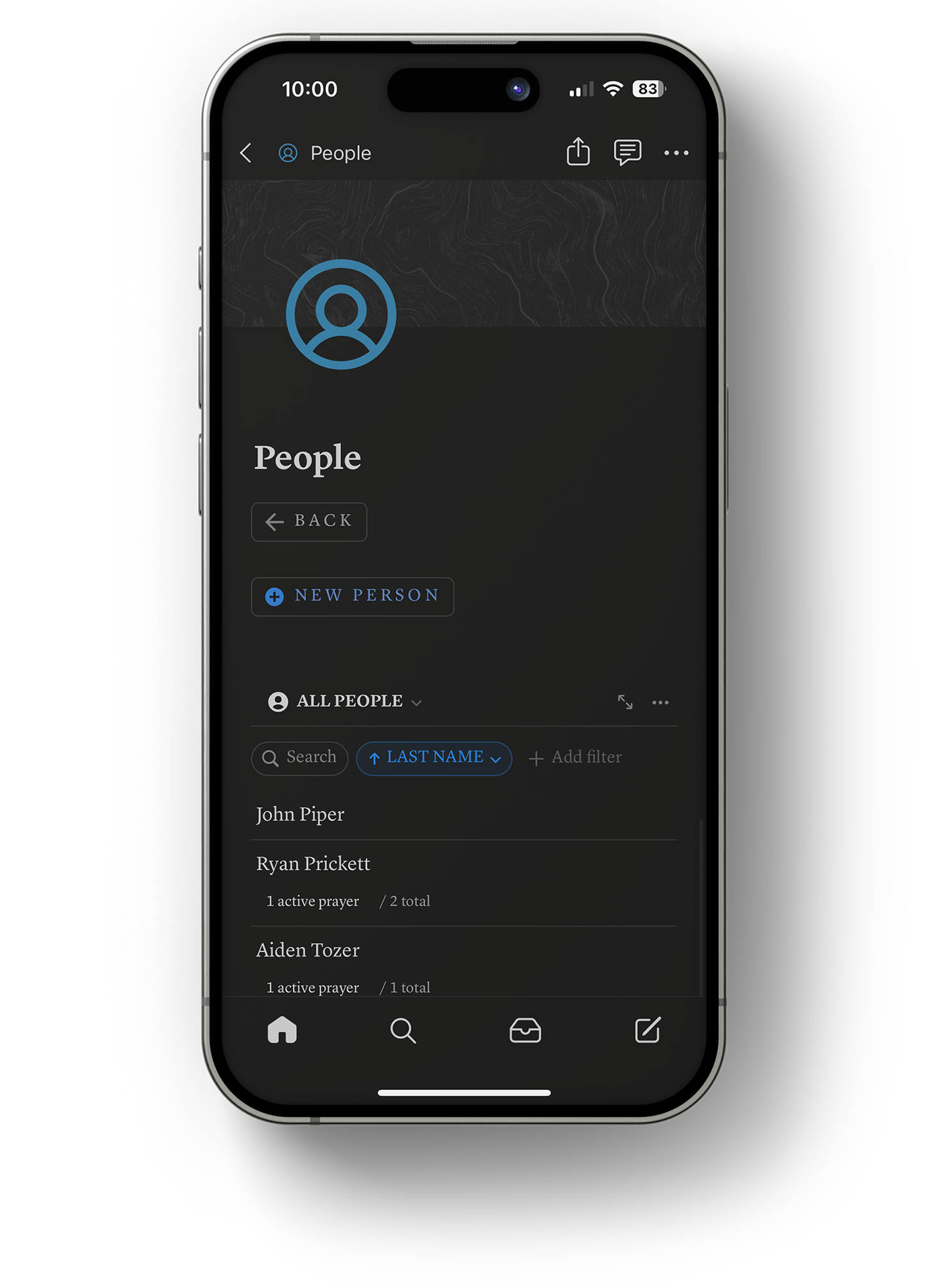 The people in your life are God's gifts, and they deserve more than a quick one-time prayer (or forgetting to pray altogether). That's why the Prayer Den comes with a contact book, letting you see prayer histories per person and making follow-ups easier. Here's how it works. CREATE A CONTACT RECORD — this can be done on the People page, or while you're editing a prayer. CONNECT CONTACTS TO PRAYERS — Add relevant contacts to the PEOPLE property of each prayer. USE THE PEOPLE PAGE — Instead of showing all your prayers (and the people related to each), this page lets you view each contact and see all the prayers related to them (both past and present). FOLLOW UP — When a prayer surfaces, reach out! Ask about updates and any opportunities to be a part of God's work in their life. When used well, the Prayer Den can help not only your prayer life, but your relationships with others.