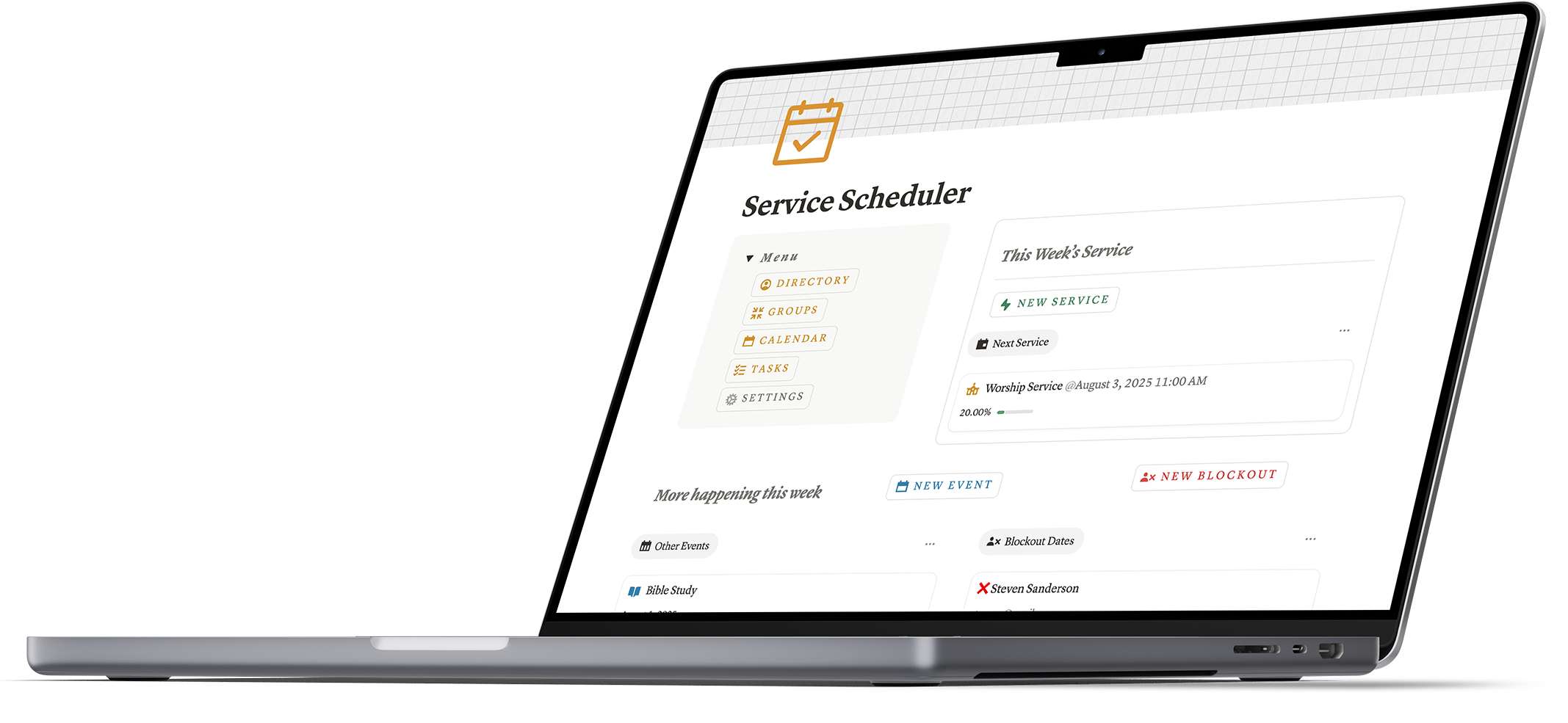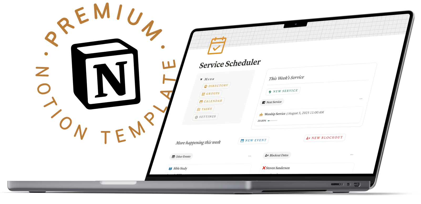 Simplify small church chaos. Organize services, volunteers, and tasks in Notion with a directory, one-click Sunday setup, and smart scheduling.