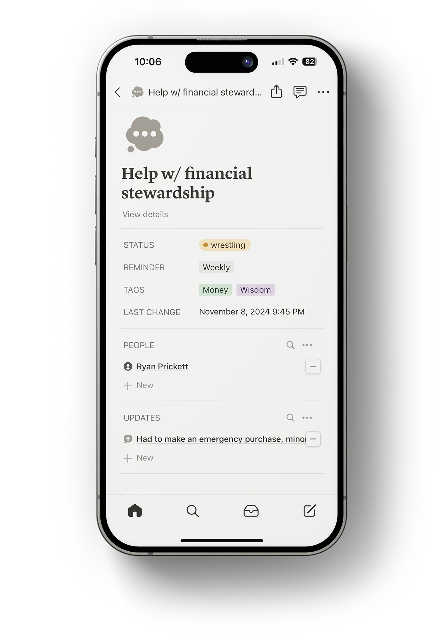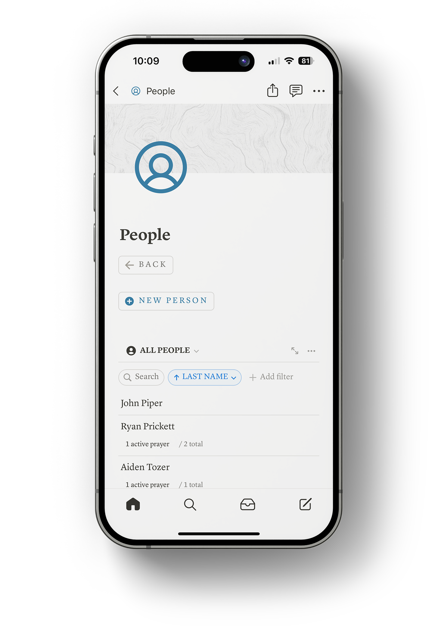 A simple, built-in contact list lets you see the prayers connected to each person. Add contact info right where you need it to check in on how God is moving in their life.