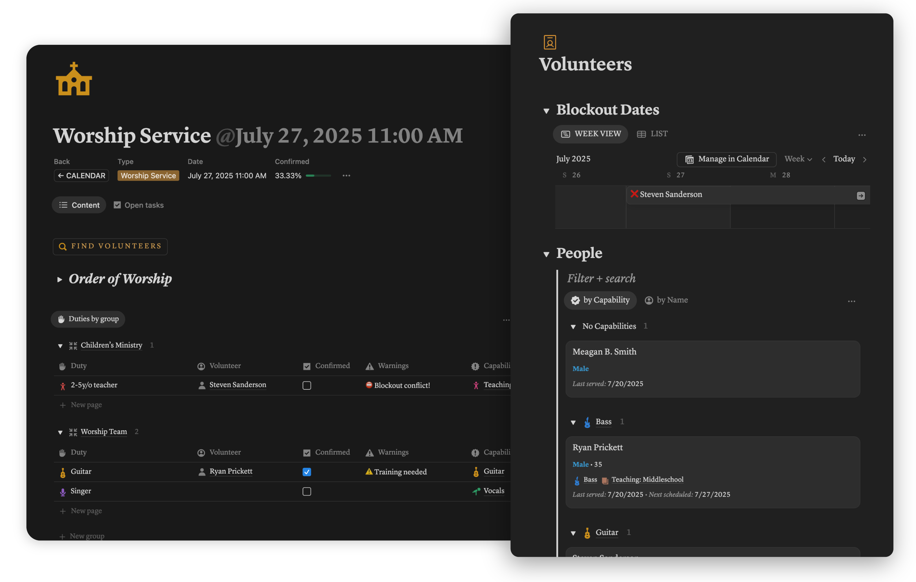 Simplify small church chaos. Organize services, volunteers, and tasks in Notion with a directory, one-click Sunday setup, and smart scheduling.
